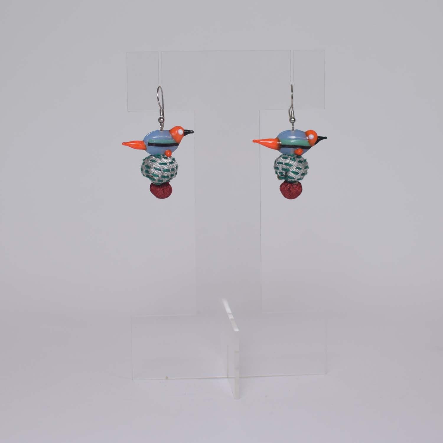 These are designed combining different shapes of fabric stuffed beads and glass birds, hanging on simple hooks. The Glass birds are completely handmade in Purdilnagar, U.P, and confluence of two crafts and two very different mediums. These are safe and easy picks that could go with multiple outfits.