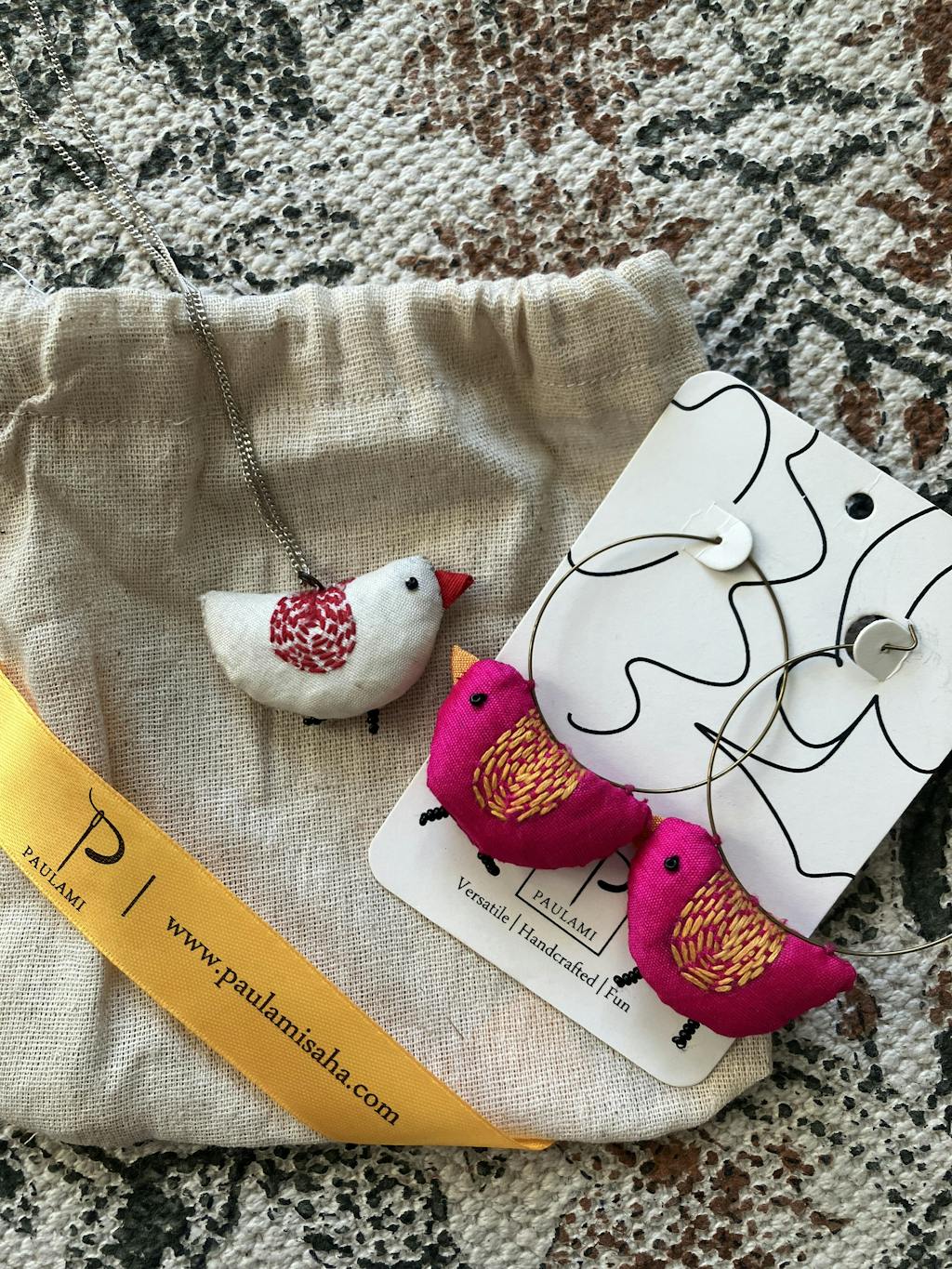 Stuffed fabric birds, fully handcrafted and embellished with Kantha stitches hang on gold colored brass wire hoops to form our bulbul baalis.