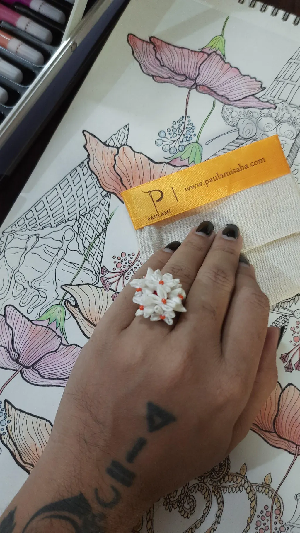 The Shiuli ring consists of a bunch of tiny fabric flowers deftly fitted on a size adjustable brass ring, to resemble spring wrapped around your finger.
